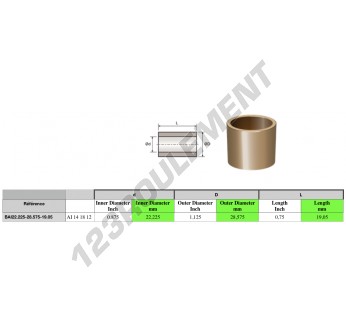 La Bague Bronze connue sous la référence BAI22.225-28.575-19.05 Générique possède un diamètre intérieur de 22.225 mm, un diamètre extérieur de 28.575 mm et une longueur de 19.05 mm. Elle est fabriquée en .