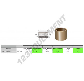 La Bague Bronze connue sous la référence BAI50.8-60.325-38.1 Générique possède un diamètre intérieur de 50.8 mm, un diamètre extérieur de 60.325 mm et une longueur de 38.1 mm. Elle est fabriquée en .