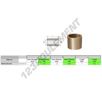 La Bague Bronze connue sous la référence BAI76.200-88.900-76.200 Générique possède un diamètre intérieur de 76.2 mm, un diamètre extérieur de 88.9 mm et une longueur de 76.2 mm. Elle est fabriquée en .