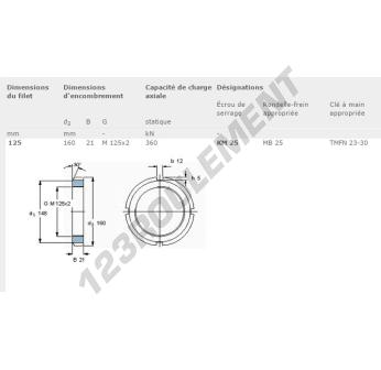 Cet écrou KM25-SKF possède un diamètre intérieur de 125mm, un diamètre extérieur de 160mm et une épaisseur de 21mm.