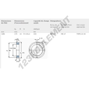 Cet écrou KM27-SKF possède un diamètre intérieur de 135mm, un diamètre extérieur de 175mm et une épaisseur de 22mm.