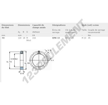 Cet écrou KMK18-SKF possède un diamètre intérieur de 90mm, un diamètre extérieur de 120mm et une épaisseur de 18mm.