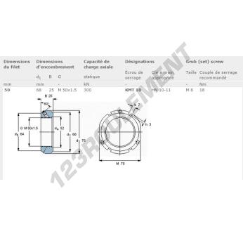 Cet écrou KMT10-SKF possède un diamètre intérieur de 50mm, un diamètre extérieur de 68mm et une épaisseur de 25mm.