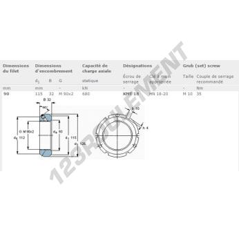 Cet écrou KMT18-SKF possède un diamètre intérieur de 90mm, un diamètre extérieur de 115mm et une épaisseur de 32mm.