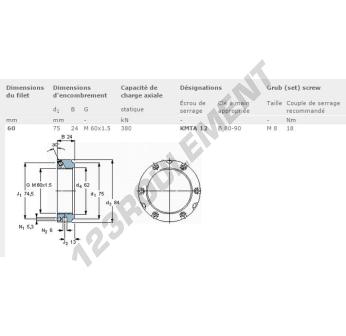 Cet écrou KMTA12-SKF possède un diamètre intérieur de 60mm, un diamètre extérieur de 75mm et une épaisseur de 24mm.