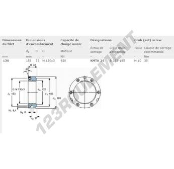 Cet écrou KMTA26-SKF possède un diamètre intérieur de 130mm, un diamètre extérieur de 156mm et une épaisseur de 32mm.