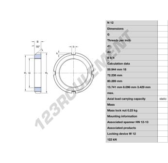 Cet écrou N12-SKF possède un diamètre intérieur de 59.944mm, un diamètre extérieur de 80.289mm et une épaisseur de 13.741mm.