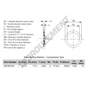 La Rondelle Ondulée - Type Compression de référence WSW-CT-71-61-0.80-5 possède un diamètre intérieur de 61 mm, un diamètre extérieur de 71 mm et une épaisseur de 0.8 mm. Elle est fabriquée en matière ACIER.