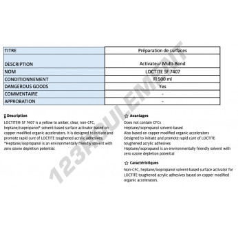 Le Loctite SF 7407 500ML est un activateur de polymérisation rapide de 500ML, spécialement conçu pour les applications industrielles nécessitant une performance d'adhésion maximale et un séchage rapide.
