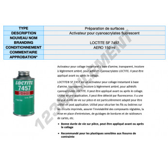 Le Loctite SF 7457 150ML est un activateur polyvalent de 150ML, qui optimise la polymérisation des adhésifs Loctite, réduisant ainsi les délais de durcissement pour une efficacité maximale.