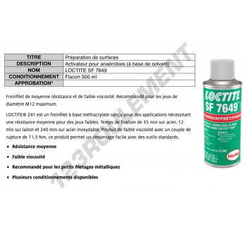 Le Loctite SF 7649 500ML est un activateur puissant de 500ML, conçu pour accélérer la polymérisation des adhésifs Loctite et garantir une prise rapide sur une variété de surfaces industrielles. Il permet d'améliorer l'adhérence et de réduire le temps de séchage.