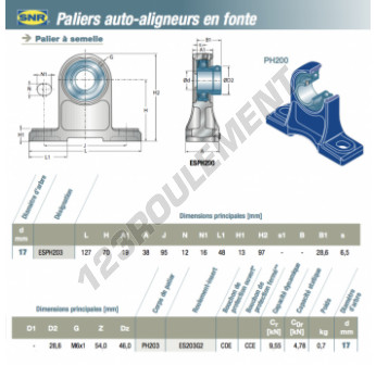 Le Palier - 2 Fixations connu sous la référence ESPH203-SNR SNR possède un diamètre d'alésage de 17 mm et un entraxe de fixation de 95 mm. Cette référence est fabriquée en fonte et le type de serrage se fait par Bague de blocage excentrique.