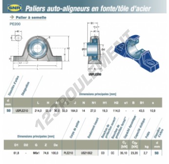 Le Palier - 2 Fixations connu sous la référence USPLE210-SNR SNR possède un diamètre d'alésage de 50 mm et un entraxe de fixation de 164 mm. Cette référence est fabriquée en fonte et le type de serrage se fait par vis de blocage.