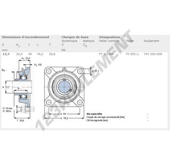 Le Palier - 4 Fixations connu sous la référence FY1-2-RM-SKF de la marque SKF possède un diamètre d'alésage de 12.7 mm et un entraxe de fixation de 54 mm. Cette référence est fabriquée en fonte et le type de serrage se fait par Bague de blocage excentrique.