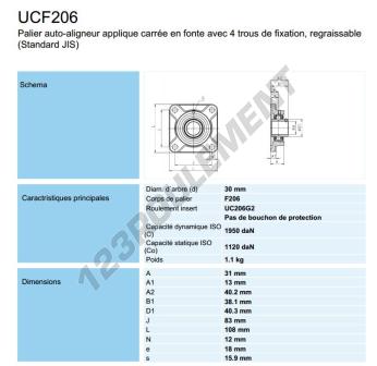 Le Palier - 4 Fixations connu sous la référence UCF206-NTN de la marque NTN possède un diamètre d'alésage de 30 mm et un entraxe de fixation de 83 mm. Cette référence est fabriquée en fonte et le type de serrage se fait par vis de blocage.