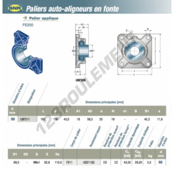 Le Palier - 4 Fixations connu sous la référence USF211-SNR de la marque SNR possède un diamètre d'alésage de 55 mm et un entraxe de fixation de 130 mm. Cette référence est fabriquée en fonte et le type de serrage se fait par vis de blocage.