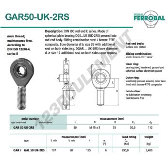 La Rotule Ge connue sous la référence GAR50-UK-2RS-DURBAL, de la marque DURBAL possède un diamètre intérieur de 50mm, un diamètre extérieur de 112mm et une épaisseur de 35mm.