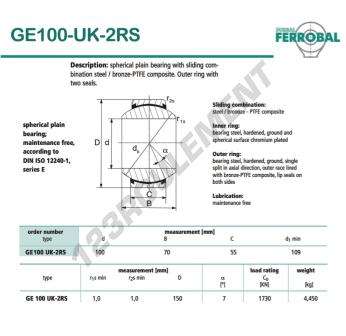 La Rotule Geew connue sous la référence GE100-UK-2RS-DURBAL, de la marque DURBAL possède un diamètre intérieur de 100mm, un diamètre extérieur de 150mm et une épaisseur de 55mm.