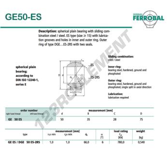 La Rotule Geew connue sous la référence GE50-ES-DURBAL, de la marque DURBAL possède un diamètre intérieur de 50mm, un diamètre extérieur de 75mm et une épaisseur de 28mm.