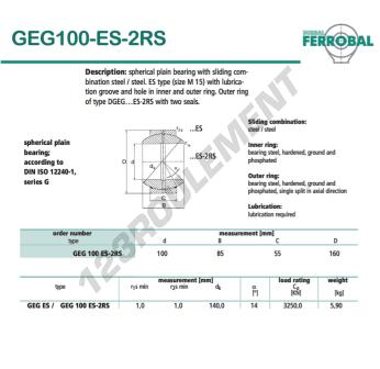 La Rotule Geg connue sous la référence GEG100-ES-2RS-DURBAL DURBAL possède un diamètre intérieur de 100 mm, un diamètre extérieur de 160 mm et une épaisseur de 55 mm.