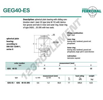 La Rotule Geg connue sous la référence GEG40-ES-DURBAL DURBAL possède un diamètre intérieur de 40 mm, un diamètre extérieur de 68 mm et une épaisseur de 25 mm.