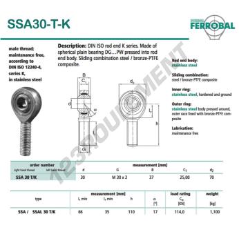 La Rotule Sa connue sous la référence DSSA30-T-K-DURBAL, de la marque DURBAL possède un pas de vis de et un Filetage à droite, un diamètre intérieur de 30mm, un diamètre extérieur de 70mm et une épaisseur de 37mm.