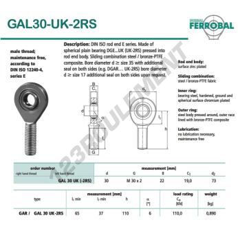 La Rotule Sa connue sous la référence GAL30-UK-2RS-DURBAL, de la marque DURBAL possède un pas de vis de et un Filetage à gauche, un diamètre intérieur de 30mm, un diamètre extérieur de 73mm et une épaisseur de 22mm.