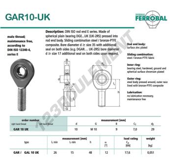 La Rotule Sa connue sous la référence GAR10-UK-DURBAL, de la marque DURBAL possède un pas de vis de et un Filetage à droite, un diamètre intérieur de 10mm, un diamètre extérieur de 29mm et une épaisseur de 9mm.