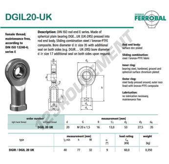 La Rotule Si connue sous la référence DGIL20-UK-DURBAL, de la marque DURBAL possède un diamètre intérieur de 20mm, un diamètre extérieur de 53mm et une épaisseur de 16mm.