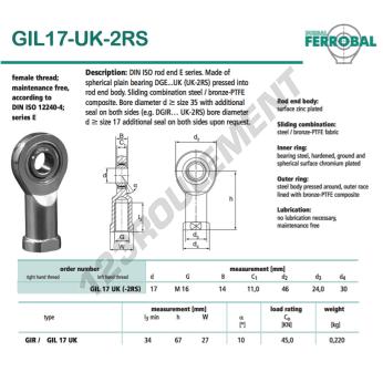 La Rotule Si connue sous la référence GIL17-UK-2RS-DURBAL, de la marque DURBAL possède un diamètre intérieur de 17mm, un diamètre extérieur de 46mm et une épaisseur de 14mm.