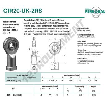 La Rotule Si connue sous la référence GIR20-UK-2RS-DURBAL, de la marque DURBAL possède un diamètre intérieur de 20mm, un diamètre extérieur de 53mm et une épaisseur de 16mm.