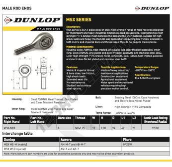 La Rotule Tsm connue sous la référence MSX-M08-DUNLOP, de la marque DUNLOP possède un pas de vis de Filetage à droite, un diamètre intérieur de 8mm, un diamètre extérieur de 12mm et une épaisseur de 9mm.