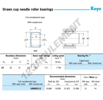 Le Roulement à Aiguilles, connu sous la référence 16MM2212-JTEKT, de la marque JTEKT, possède un diamètre intérieur de 16mm, un diamètre extérieur de 22mm et une épaisseur de 12mm.