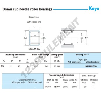 Le Roulement à Aiguilles, connu sous la référence MHKM1510-JTEKT, de la marque JTEKT, possède un diamètre intérieur de 15mm, un diamètre extérieur de 22mm et une épaisseur de 10mm.