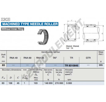 Le Roulement à Aiguilles, connu sous la référence TR8310845-IKO, de la marque IKO, possède un diamètre intérieur de 83mm, un diamètre extérieur de 108mm et une épaisseur de 45mm.