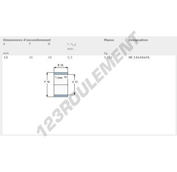 La Bague Intérieure connue sous la référence IR12X16X16-SKF de la marque SKF possède un diamètre intérieur de 12 mm, un diamètre extérieur de 16 mm et une longueur de 16 mm.