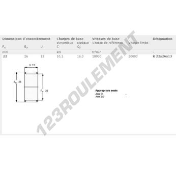 La Cage à Aiguilles, connue sous la référence K22X26X13-SKF, de la marque SKF, possède un diamètre intérieur de 22 mm, un diamètre extérieur de 26 mm et une épaisseur de 13 mm.