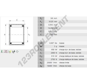 La Douille à Aiguilles, connue sous la référence BCE65-INA, de la marque INA, possède un diamètre intérieur de 9.53 mm, un diamètre extérieur de 14.29 mm et une épaisseur de 7.92 mm.