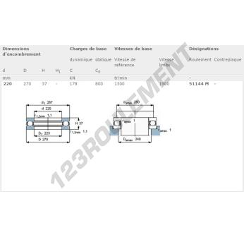 La Butée à Billes, connue sous la référence 51144-M-SKF, de la marque SKF, possède un diamètre intérieur de 220mm, un diamètre extérieur de 270mm et une épaisseur de 37mm.