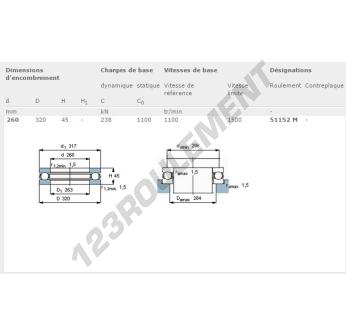 La Butée à Billes, connue sous la référence 51152-M-SKF, de la marque SKF, possède un diamètre intérieur de 260mm, un diamètre extérieur de 320mm et une épaisseur de 45mm.