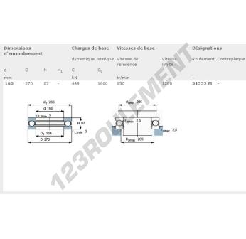 La Butée à Billes, connue sous la référence 51332-M-SKF, de la marque SKF, possède un diamètre intérieur de 160mm, un diamètre extérieur de 270mm et une épaisseur de 87mm.
