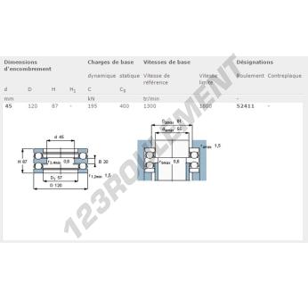 La Butée à Billes, connue sous la référence 52411-SKF, de la marque SKF, possède un diamètre intérieur de 45mm, un diamètre extérieur de 120mm et une épaisseur de 87mm.