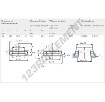 La Butée à Billes, connue sous la référence 53312-SKF, de la marque SKF, possède un diamètre intérieur de 60mm, un diamètre extérieur de 110mm et une épaisseur de 38.3mm.