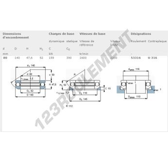 La Butée à Billes, connue sous la référence 53316-SKF, de la marque SKF, possède un diamètre intérieur de 80mm, un diamètre extérieur de 140mm et une épaisseur de 52mm.