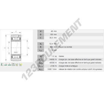 Le Galet à Billes, connu sous la référence LR5308-X-2Z-INA, de la marque INA, possède un diamètre intérieur de 40mm, un diamètre extérieur de 100mm et une épaisseur de 36.5mm.