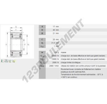 Le Galet à Billes, connu sous la référence NATR17-PP-INA, de la marque INA, possède un diamètre intérieur de 17mm, un diamètre extérieur de 40mm et une épaisseur de 21mm.