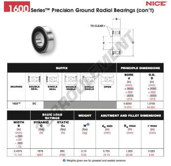 Le Roulement à Billes, connu sous la référence 1623-DC-NICE, de la marque NICE, possède un diamètre intérieur de 15.875mm, un diamètre extérieur de 34.925mm et une épaisseur de 11.113mm.