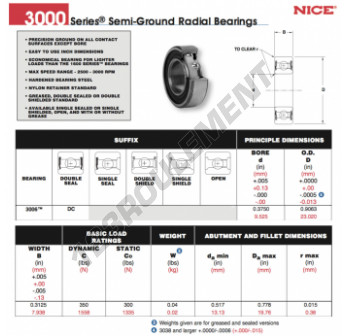 Le Roulement à Billes, connu sous la référence 3006-DC-NICE, de la marque NICE, possède un diamètre intérieur de 9.525mm, un diamètre extérieur de 23.02mm et une épaisseur de 7.938mm.