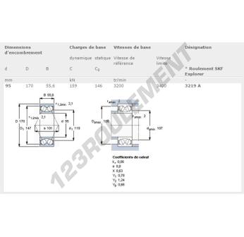 Le Roulement à Billes, connu sous la référence 3219-A-SKF, de la marque SKF, possède un diamètre intérieur de 95mm, un diamètre extérieur de 170mm et une épaisseur de 55.6mm.
