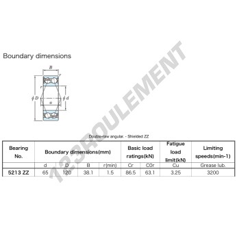 Le Roulement à Billes, connu sous la référence 5213-ZZ-JTEKT, de la marque JTEKT, possède un diamètre intérieur de 65mm, un diamètre extérieur de 120mm et une épaisseur de 38.1mm.